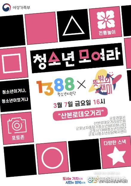 (중앙뉴스타임스 = 방재영 기자) (재)군포시청소년재단 군포시청소년상담복지센터는 3월 7일 금요일 산본로데오거리에서 청소년기관 연합아웃리치'뜻밖의 재미'를 개최한다.
