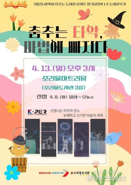 (중앙뉴스타임스 = 방재영 기자) 오산시는 2025년 도서관 주간을 기념하여 오는 13일 오후 3시, 소리울도서관 아트리움에서 '2025 음악이 흐르는 도서관 콘서트 정기공연 #1 × 도서관주간 – 춤추는 타악, 마법에 빠지다'를 개최한다고 7일 밝혔다.