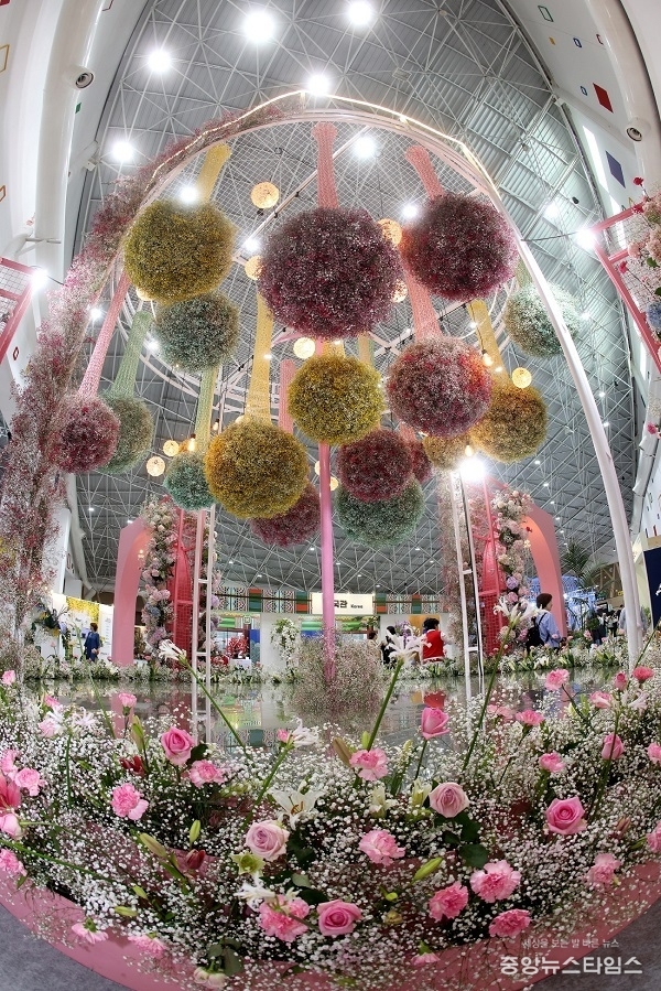 (중앙뉴스타임스 = 방재영 기자) 2025고양국제꽃박람회 실내전시관에 들어서자마자 보이는 공중 화훼장식이 시선을 사로잡는다. 로비부터 중앙홀까지 행잉 플라워, 플리저브드 플라워로 가득 채운 입체 정원 ‘플라워 원더랜드’가 실내 화훼 전시의 화려함을 더한다.