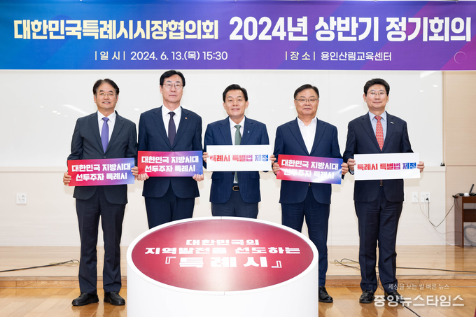 (중앙뉴스타임스 = 방재영 기자) 대한민국특례시시장협의회(대표회장 고양특례시장 이동환)는 지난 13일 용인산림교육센터에서 이동환 고양특례시장, 이재준 수원특례시장, 이상일 용인특례시장, 홍남표 창원특례시장과 정명근 화성시장이 참석한 가운데 2024년 상반기 정기회의를 개최했다. 화성시는 지난해 12월 인구 100만 명이 넘어 올해부터 협의회 준회원 자격을 얻었다.