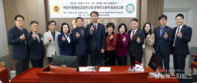 (중앙뉴스타임스 = 방재영 기자) 경기도의회 여성가족평생교육연구회(회장 김재균)는 21일 여성가족평생교육위원회 회의실에서 ‘경기도 맞벌이 부부 지원 강화를 위한 정책연구’ 최종보고회를 개최했다.