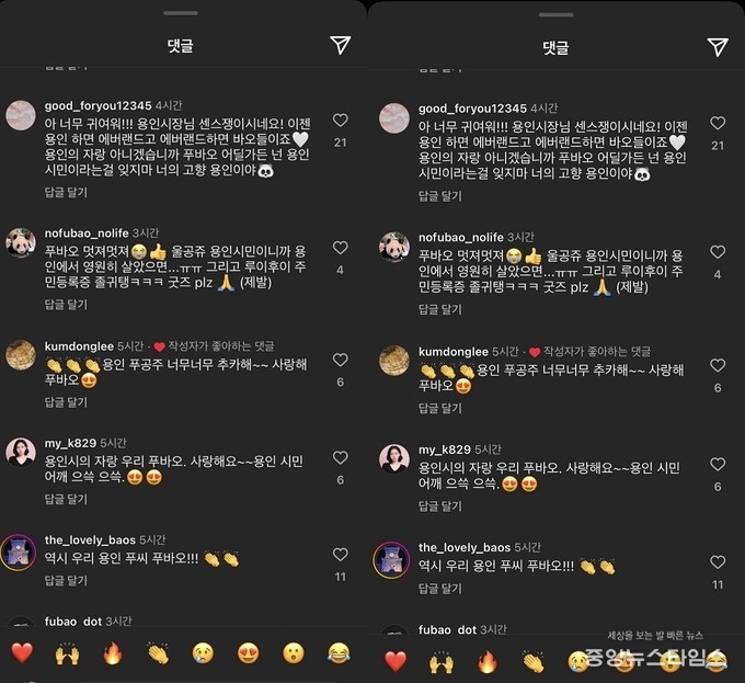 용인시민으로 보이는 한 네티즌은 인스타그램에 “용인시민입니다. 푸바오가 우리 시민이 된 것을 격하게 환영하고 축하합니다. 푸바오 축하해!”라는 댓글을 남겼고, 또 다른 네티즌은 “혹시 용인 푸씨로 입적 가능한가요?(진지)”라는 댓글을 남겨 웃음을 자아냈다.