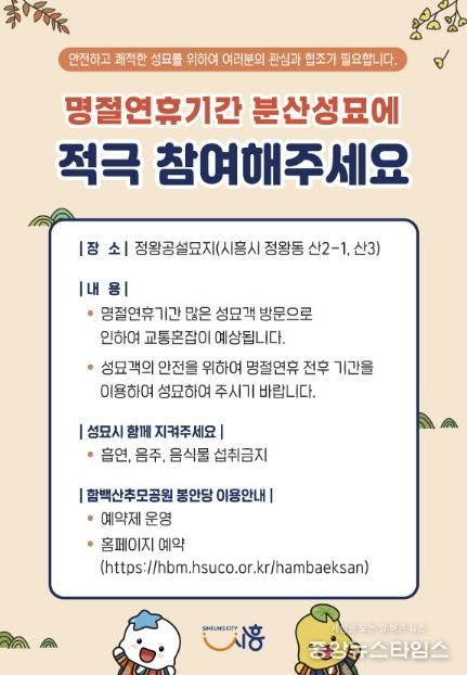 (중앙뉴스타임스 = 방재영 기자) 시흥시는 민족 고유의 명절인 설을 맞이해 성묘객 밀집에 따른 안전사고 방지 및 편의 증진을 위해 명절 연휴 전후 분산 성묘를 적극 유도하고 있다.