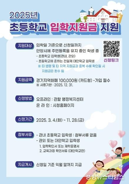 (중앙뉴스타임스 = 방재영 기자) 안양시가 올해 처음으로 2025년 초등학교 입학생을 대상으로 입학지원금 10만원을 지급한다고 28일 밝혔다.