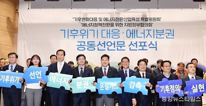 ‘더불어민주당 기후변화대응 및 에너지전환산업육성 특별위원회’와 ‘에너지정책 전환을 위한 지방정부협의회’는 20일 국회에서 기후위기 극복을 위한 에너지분권 공동선언을 발표했다.