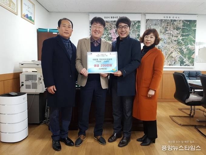 (중앙뉴스타임스 = 방재영 기자) 오산시 대원동 주민자치위원회가 21일 다가오는 설을 맞아 관내 저소득 10가구에 20만원씩 총 200만원의 성금을 기탁했다.