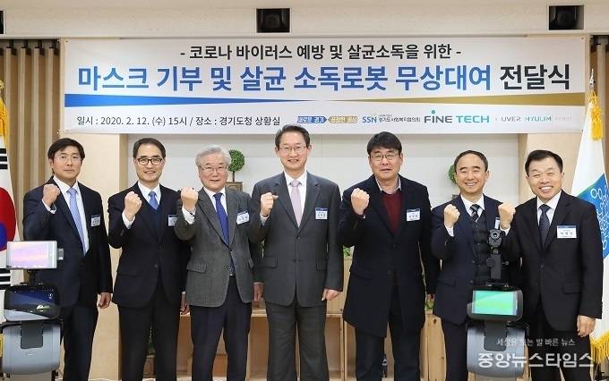 경기도는 12일 오후 경기도청 상황실에서 김희겸 경기도 행정1부지사, 이경학 경기도사회복지협의회 회장과 마스크 제조업체 파인텍 박민자 대표, 살균로봇 제작업체 ㈜유버 강용훈 대표, 안면인식 발열측정로봇업체 휴림로봇(주) 이권노 대표 등이 참석한 가운데 ‘마스크 기부 및 자외선 살균로봇 무상대여 전달식’을 개최했다.