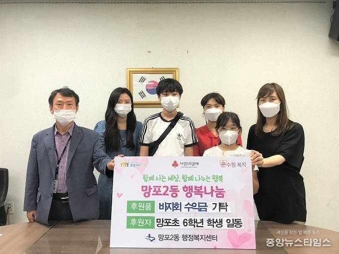 (중앙뉴스타임스 = 이강범 기자) 수원시 영통구 망포초등학교(교장 안영희) 6학년 학생들이 23일 망포2동행정복지센터를 방문해 지역 내 어려운 이웃을 위해 성금(약 50만원)을 기탁했다.