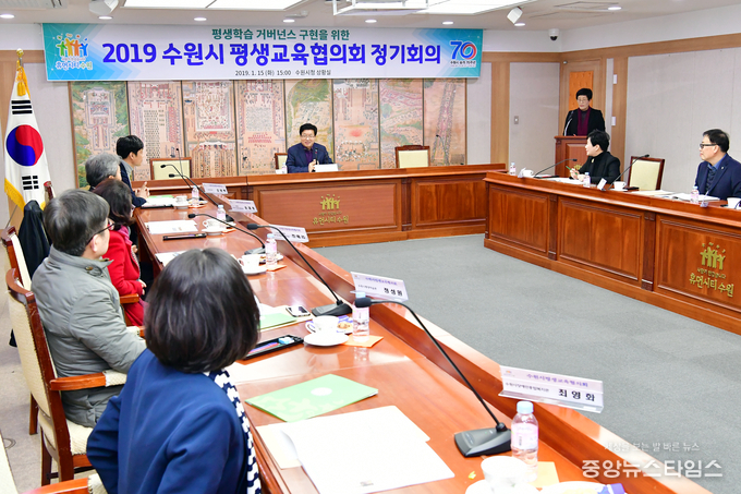 수원시는 15일 시청 상황실에서 ‘수원시 평생교육협의회 정기회의’를 열고 2019년 평생교육사업 운영계획을 제시했다. 또 주요 현안 사항을 논의했다.
