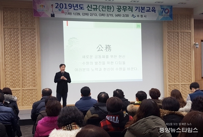 김준혁 한신대 교수가 29일 수원시청 중회의실에서 신규 공무직 직원들에게 바람직한 공직 태도 등을 알리고 있다. (사진 = 수원시)