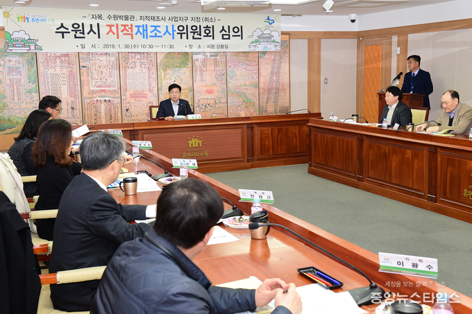 수원시는 30일 시청 상황실에서 2019년도 제1회 수원시 지적재조사위원회를 열고, ‘자목지구 지적재조사 사업지구 지정’과 ‘수원박물관지구 지적재조사 사업지구 취소’를 심의·의결했다.