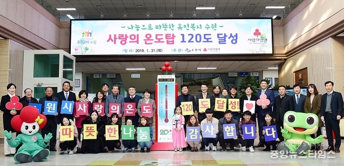 수원시는 31일 시청 로비에서 ‘사랑의 온도탑 120도 달성’ 기념행사를 열고 목표 달성을 축하했다.