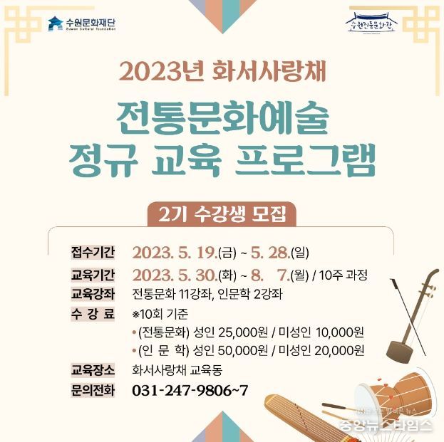 (중앙뉴스타임스 = 방재영 기자) 수원문화재단은 오는 30일부터 8월 7일까지 화서사랑채에서 ‘2023년 화서사랑채 전통문화예술 정규 교육 프로그램 2기’ 강좌를 운영한다.