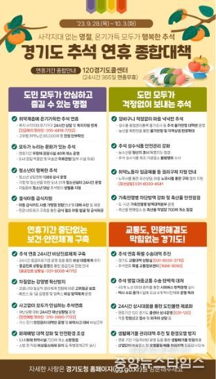 (중앙뉴스타임스 = 방재영 기자) 경기도가 취약계층을 포함한 모든 도민이 마음 놓고 쉴 수 있는 안전하고 편안한 명절을 위해 ‘추석 연휴 종합대책’을 추진한다.