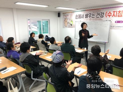 (중앙뉴스타임스 = 김수진 기자) 동두천시는 지난 19일 주민 20여 명이 참석한 가운데 ‘손에서 배우는 건강(수지침)프로그램’을 개강했다.