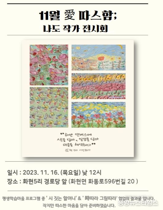 (중앙뉴스타임스 = 김수진 기자) 포천시는 오는 16일 화현5리 경로당에서 마을 주민들의 시와 미술 작품을 기반으로 한 ‘11월 愛 따스함: 나도 작가전시회’를 개최한다고 밝혔다.