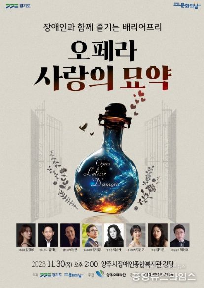 (중앙뉴스타임스 = 김수진 기자) 양주시는 양주오페라단이 오는 30일 오후 2시 양주시장애인종합복지관 강당에서 장애인과 일반시민들을 대상으로 한 ‘배리어프리 오페라 '사랑의 묘약'’ 공연을 개최한다고 밝혔다.