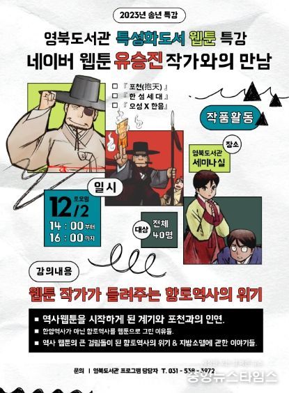 (중앙뉴스타임스 = 김수진 기자) 포천시는 오는 12월 2일 14시 포천시 영북도서관 세미나실에서 2023년 송년 특강 ‘유승진 웹툰 작가와의 만남’을 진행한다.
