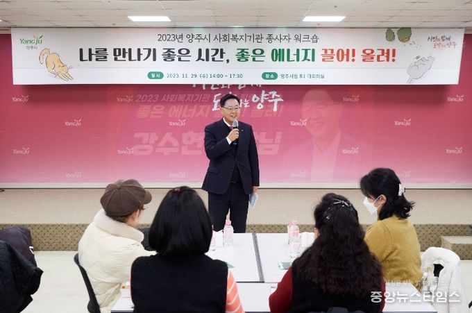 (중앙뉴스타임스 = 김수진 기자) 강수현 양주시장이 지난 29일 양주시청 지하 대회의실에서 열린 ‘2023년 양주시 사회복지기관 종사자 워크숍’에 참석했다.