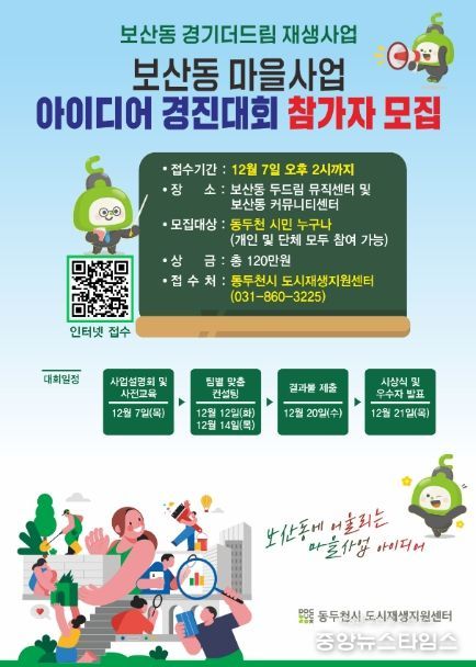 (중앙뉴스타임스 = 김수진 기자) 동두천시 도시재생지원센터는 오는 12월 7일부터 ‘보산동 마을사업 아이디어 경진대회’를 개최한다고 밝혔다.