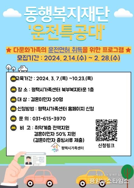 (중앙뉴스타임스 = 방재영 기자) 평택시가족센터는 오는 7일부터 관내 결혼이주여성의 운전면허 취득을 위한 ‘안전운전 특공대’ 과정을 운영한다.