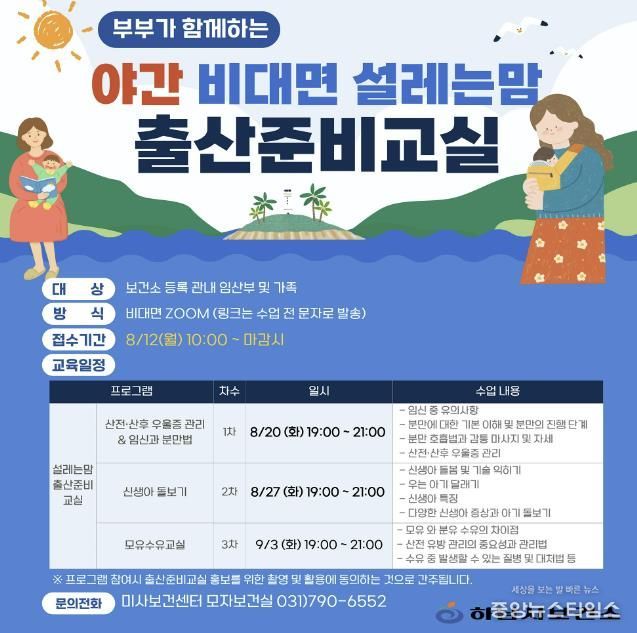 하남시에 거주하는 임산부와 그 가족이라면 누구나 무료로 프로그램에 참여할 수 있으며, 오는 8월 12일 오전 10시부터 미사보건센터 모자보건실을 통해 선착순 신청하면 된다.