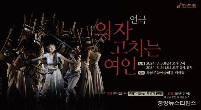 (중앙뉴스타임스 = 방재영 기자) 깊은 인간애와 삶의 소중한 가치를 되새기게 하는 연극, 극단 물결의 '의자 고치는 여인'(연출:송현옥)이 오는 8월 30일과 31 하남문화재단 무대에 오른다.