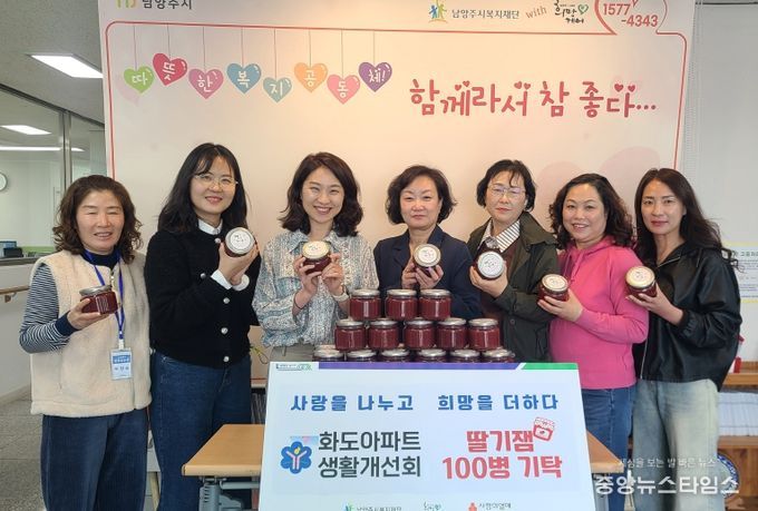 (중앙뉴스타임스 = 방재영 기자) 남양주시 화도읍 아파트생활개선회는 지난 3일 취약계층을 위한 딸기잼 100병(50kg 상당)을 동부희망케어센터에 전달했다.
