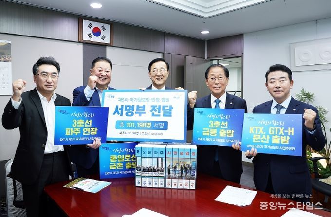 (중앙뉴스타임스 = 방재영 기자) 파주시는 지난 18일 3호선 연장, 통일로선 신설, 케이티엑스 연장 등 파주시가 추진 중인 철도사업을 제5차 국가철도망구축계획에 반영해 달라는 요구를 담은 파주시민 10만 인의 서명부를 김윤덕 국토교통부장관에게 전달했다고 밝혔다.
