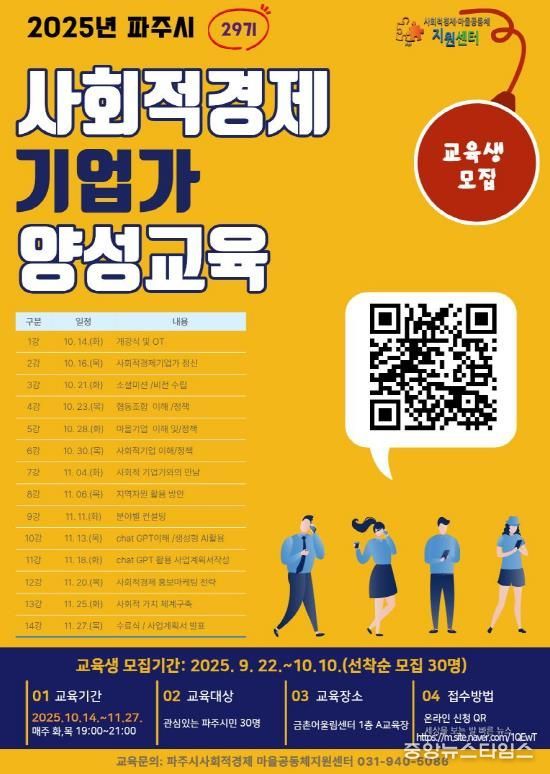 (중앙뉴스타임스 = 방재영 기자) 파주시는 사회적가치 실현을 위한 사회적경제 생태계 확산을 목표로 ‘2025년 하반기 사회적경제 기업가 양성 교육’을 운영한다.