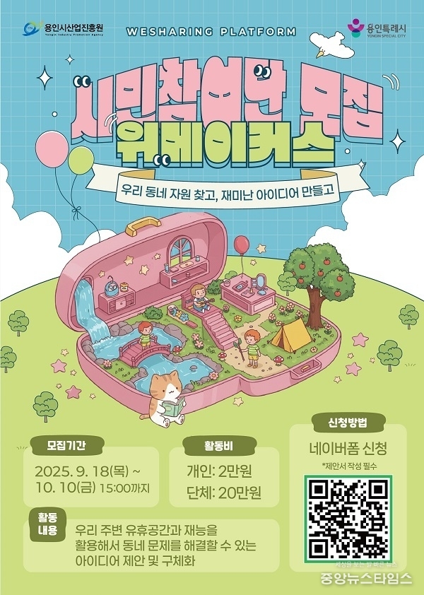 (중앙뉴스타임스 = 방재영 기자) 용인시산업진흥원은 시민이 직접 만드는 도시 자산 공유 플랫폼 '위쉐어링(WeSharing)' 개발을 위해 시민참여단 '위메이커스(WeMakers)'를 모집한다고 24일 밝혔다.