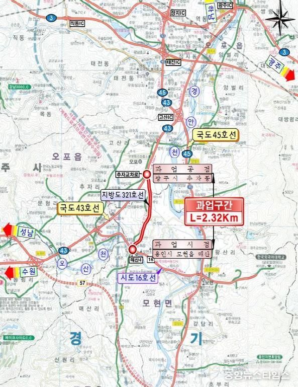 (중앙뉴스타임스 = 방재영 기자) 용인시 처인구 모현읍 매산리와 광주시 추자동을 연결하는 ‘지방도321호선 매산~일산간 도로 확포장공사’가 완료돼 25일 낮 12시부터 공식 개통한다.