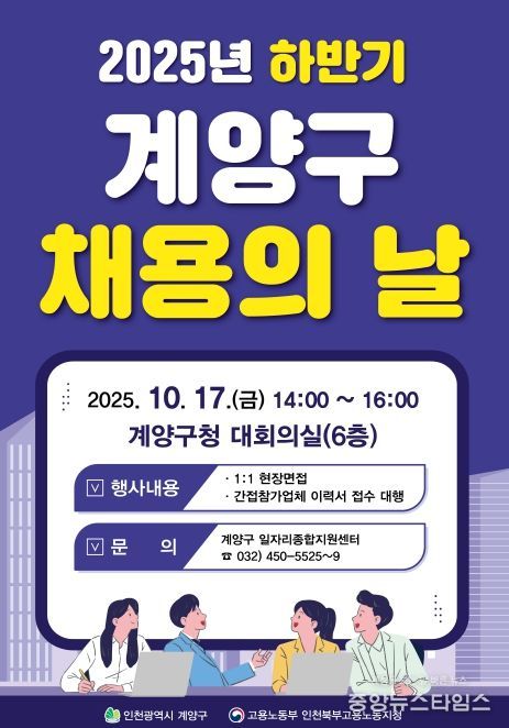 (중앙뉴스타임스 = 방재영 기자) 인천 계양구는 오는 10월 17일 오후 2시부터 4시까지 구청 6층 대회의실에서 ‘2025년 하반기 계양구 채용의 날’을 개최한다.