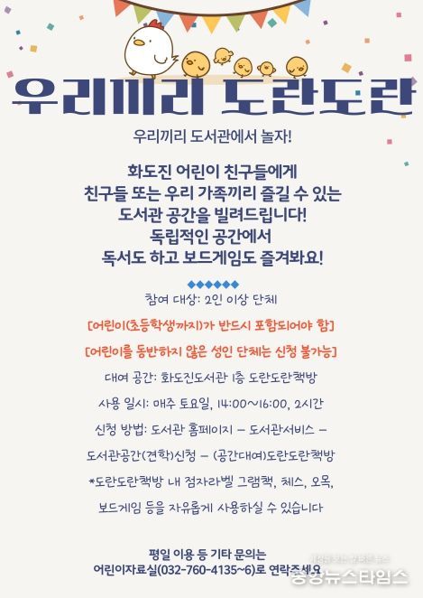 자세한 사항은 화도진도서관 누리집공지사항을 확인하거나 어린이자료실로 문의하면 된다.