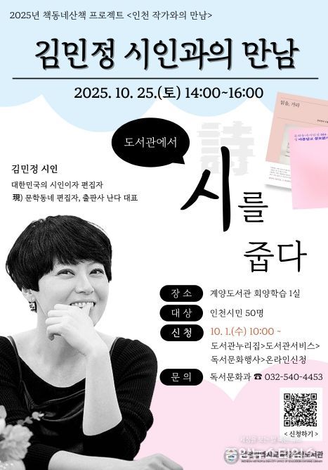 (중앙뉴스타임스 = 방재영 기자) 인천시교육청계양도서관은 10월 25일 오후 2시 ‘책동네산책 프로젝트’의 일환으로 ‘김민정 시인과의 만남’을 개최한다고 30일 밝혔다.