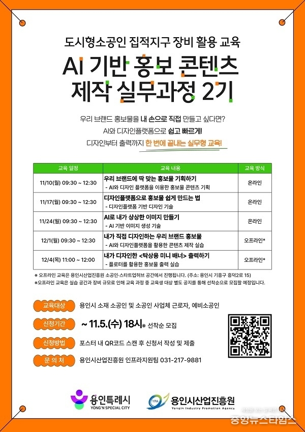 (중앙뉴스타임스 = 방재영 기자) 용인시산업진흥원은 용인 소공인의 홍보 역량 강화를 위해 'AI 기반 홍보 콘텐츠 제작 실무과정 2기'를 개설하고 교육생을 모집한다고 30일 밝혔다.