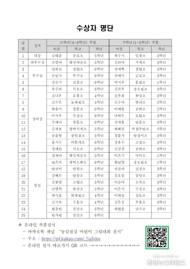 (중앙뉴스타임스 = 방재영 기자) 농협중앙회 경기지역본부는 '농심천심(農心天心) 경기도 어린이 그림 그리기 대회'를 성료했다.