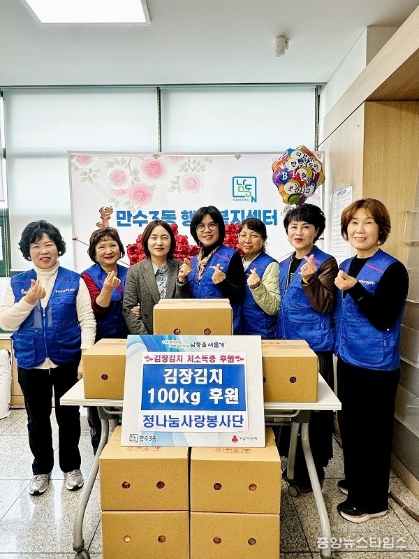 (중앙뉴스타임스 = 방재영 기자) 인천 남동구 만수3동 행정복지센터는 ‘정나눔사랑봉사단’으로부터 복지 사각지대 등 취약계층을 위한 김치 100kg을 후원받았다고 13일 밝혔다.