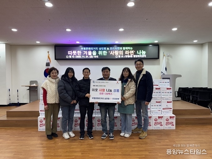 (중앙뉴스타임스 = 방재영 기자) 인천 부평구 부평4동은 지난 21일 부평문화의거리 상인회와 프리마켓 판매자들로부터 라면 120상자를 기부받았다고 밝혔다.