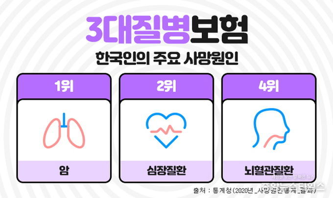 (중앙뉴스타임스 = 방재영 기자) 한국인의 주요 사망원인중에 암, 뇌혈관질환, 심혈관질환은 흔히 3대질병이라 일컬어지며 살아가면서 가장 먼저 대비해야 하는 중대질병으로 항상 강조되고 있다. 이들 질병에 미리 대비하기 위해 가입하는 것이 진단비보험인데, 이러한 3대질병진단비를 중점으로 보장하는 보장성보험이 3대진단비보험 이다. 3대질병진단비보험은 각각의 질병에 주목해서 보장하기도 하지만, 나에게 맞는 추가 특약을 잘 골라서 가입한다면 종합건강보험으로도 충분히 활용도가 높다.