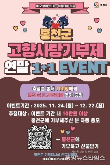 한편, 홍천군은 현재 ‘고향사랑기부제 1+1 이벤트’도 함께 추진하고 있다. 11월 24일부터 12월 22일까지 홍천군에 10만 원 이상 기부하면, 100명을 추첨해 홍천군 인기 답례품을 추가로 증정하는 행사다.