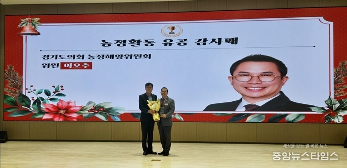 (중앙뉴스타임스 = 방재영 기자) 경기도의회 농정해양위원회 이오수 의원(국민의힘, 수원9)은 9일 농협중앙회 경기지역본부에서 농협중앙회장 감사패를 수여했다. 이번 감사패는 이 의원이 평소 농업ㆍ농촌 발전과 지역 농협 지원을 위해 지속적인 관심과 정책적 노력을 기울여 온 공로를 인정해 수여된 것이다.