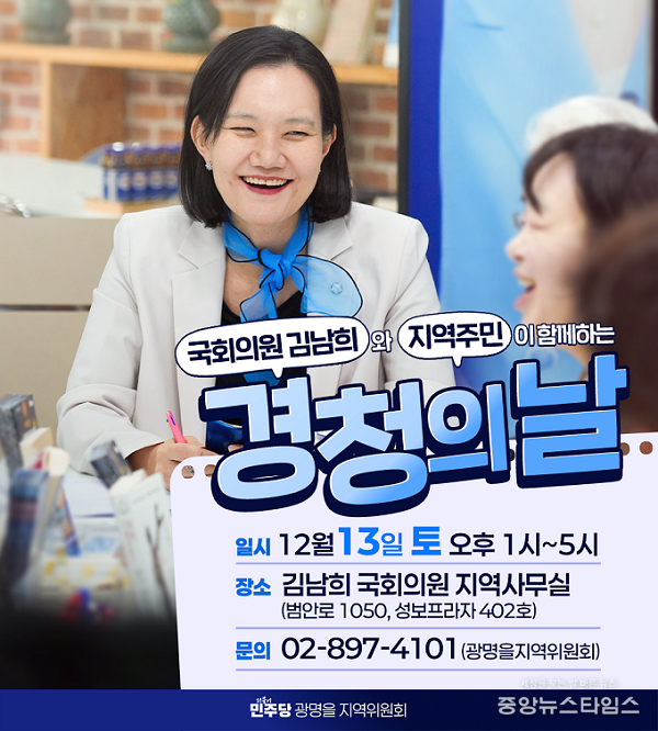 (중앙뉴스타임스 = 방재영 기자) 더불어민주당 김남희 국회의원(광명시을)이 오는 13일 오후 1~5시까지 지역사무실에서 2025년 마지막 ‘경청의 날’을 진행한다고 9일 밝혔다.
