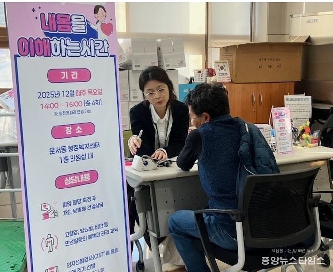 (중앙뉴스타임스 = 방재영 기자) 인천 중구 운서동 행정복지센터는 지난 4일 행정민원실에서 센터를 방문한 주민들을 대상으로 ‘혈압·혈당 측정 및 1:1 건강상담 서비스’를 제공했다고 밝혔다.