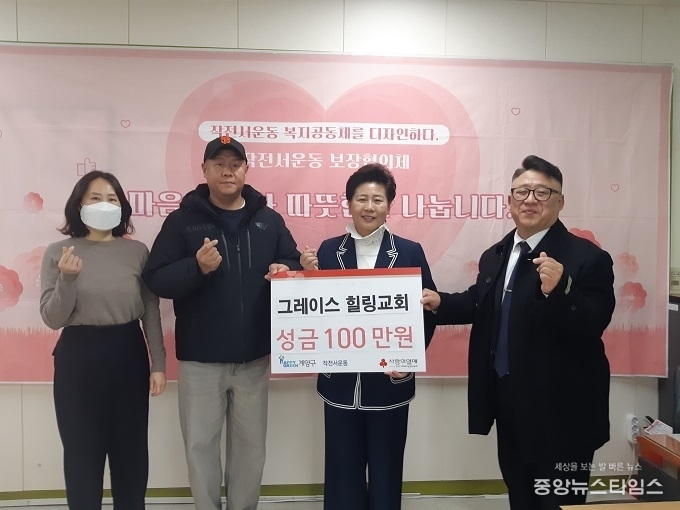 (중앙뉴스타임스 = 방재영 기자) 인천 계양구 작전서운동(동장 송영희)는 지난 5일 그레이스 힐링교회로부터 지역 취약계층 지원을 위한 성금 100만 원을 전달받았다고 밝혔다.