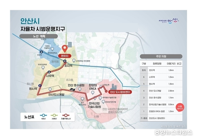 자율주행차는 상록구 사동의 안산시 도시정보센터를 기점으로 한양대ERICA 캠퍼스 정문-한국산업기술시험원-안산 호수공원-안산도시개발-원시역-시우역-초지역에 이르기까지 약 11km 구간을 누빌 예정이다.