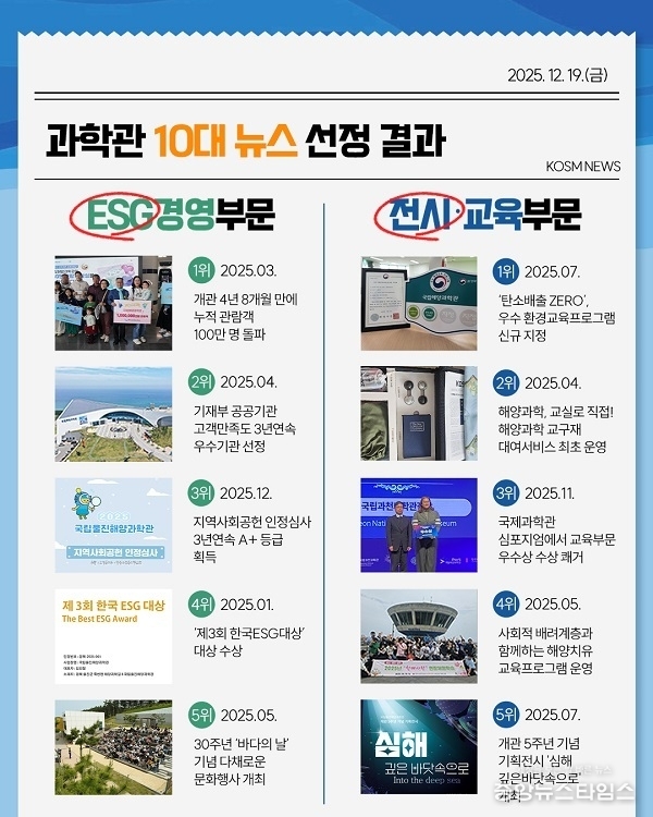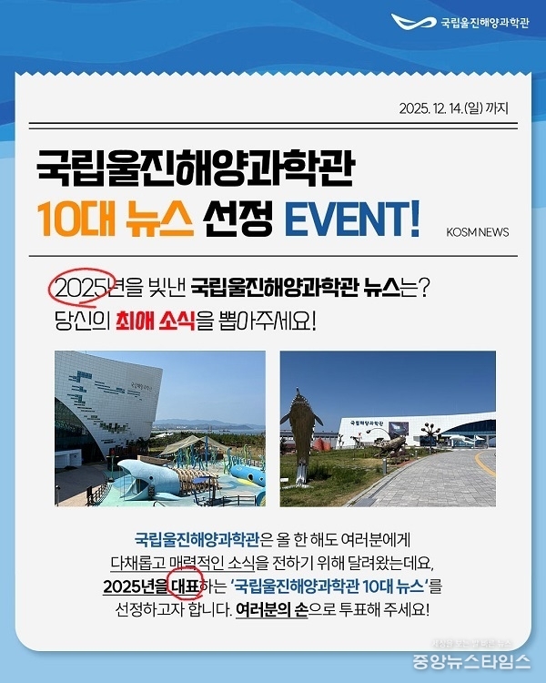 (중앙뉴스타임스 = 방재영 기자) 국립울진해양과학관 18일 2025년 한 해 동안 국민에게 가장 많은 관심과 공감을 얻은 주요 사업 및 성과 실적을 담은 ‘2025 국립울진해양과학관 10대 뉴스’를 최종 선정했다고 밝혔다.