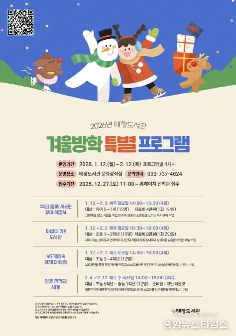 (중앙뉴스타임스 = 방재영 기자) 원주시 태장도서관은 겨울방학을 맞아 1월 12일부터 2월 12일까지 겨울방학 특별 프로그램을 운영한다고 26일 밝혔다.