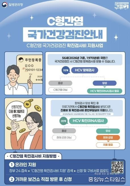 (중앙뉴스타임스 = 방재영 기자) 부천시는 국가건강검진에서 C형간염 항체 양성 판정을 받은 56세(1970년생) 시민을 대상으로 C형간염 확진검사 비용을 지원한다. 이번 사업은 C형간염 항체 양성자에 대한 확진검사비를 지원해 조기 치료를 유도하고 검진의 실효성을 높이기 위해 추진된다.