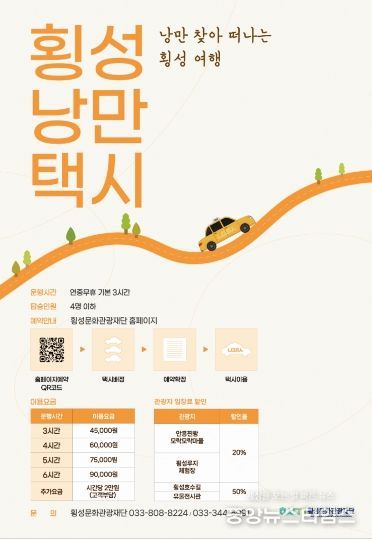 한편, 낭만택시 이용 방법과 상세한 할인 일정은 향후 횡성문화관광재단 누리집(홈페이지)을 통해 공지될 예정이다.